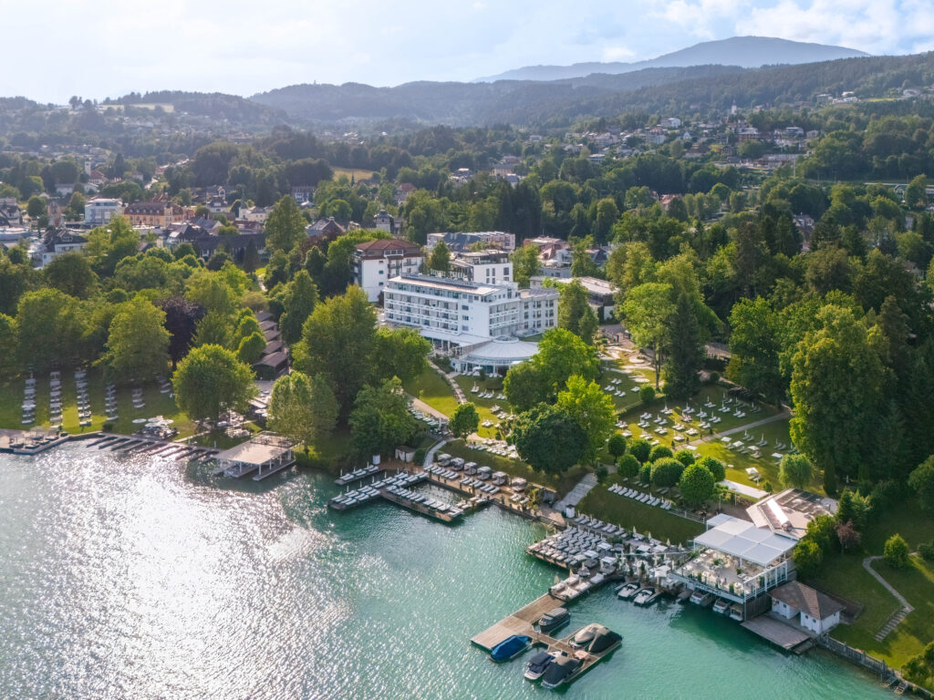 Website besuchen Das Vier-Sterne-Superior Resort liegt inmitten eines 30.000 m² großen Parks direkt am Ufer des malerischen Wörthersees und garantiert eine unvergessliche Zeit auf und neben dem Grün. Genießen Sie die idyllische (aber dennoch zentrale) Lage, den hauseigenen Badestrand und Top-Kulinarik und entspannen Sie in den stilvoll eingerichteten Zimmern und Suiten sowie im großzügigen SPA-Bereich mit Panorama-Hallenbad, Whirlpool und Saunalandschaft.